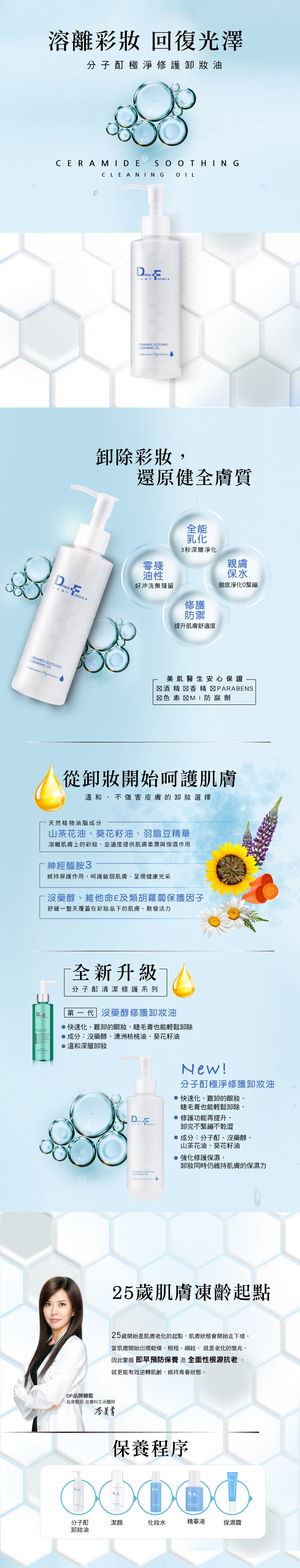 雙手與臉部均保持乾燥,取適量卸妝油於手心,輕柔按摩全臉,待彩妝完全溶解後,再以少量清水重複按摩使卸妝油乳化,最後再以大量清水洗淨全臉。