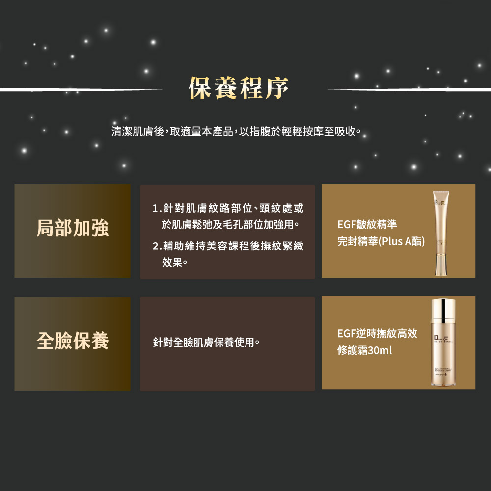 清潔肌膚後,取適量本產品,以指腹於肌膚紋路部位、頸紋處或於肌膚鬆弛及毛孔部位輕輕按摩至吸收。